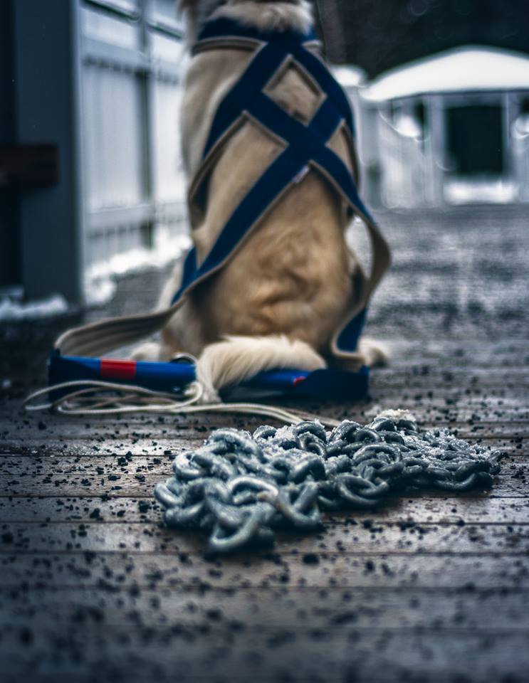 En rejäl och tålig lina att fästa mellan selen och kedjorna – och så själva kedjorna förståss. Kedjor kan man hitta på Biltema, Rusta, Jula, eller kanske lite billigare hos närmaste bonde eller på skroten. Se till att få den klippt efter vikt och välj t ex 1, 2, 4 och 6 kilo (beroende på vad din egen hund väger).